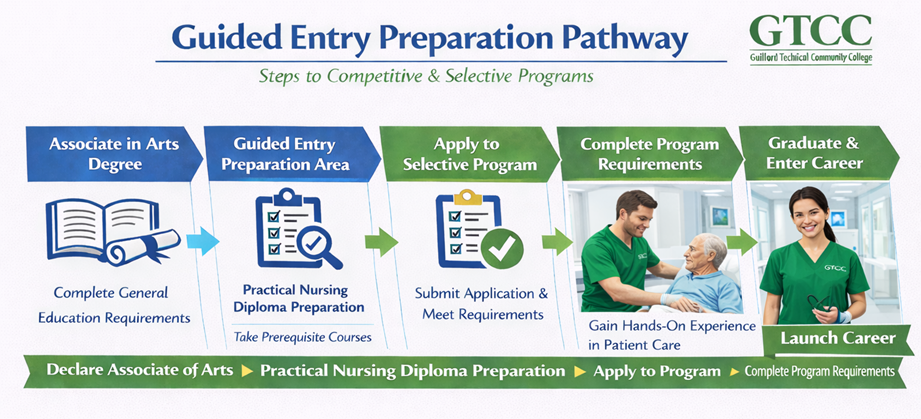 Students who intend to apply to selective or limited admission programs at Guilford Technical Community College may declare a Guided Entry Preparation Area while completing prerequisite coursework.